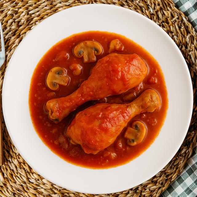 Un plato sabroso y reconfortante, donde la suavidad del pollo se realza con el fondo de verduras y el punto justo de vino. Ideal para quienes disfrutan de recetas cocinadas con mimo.
