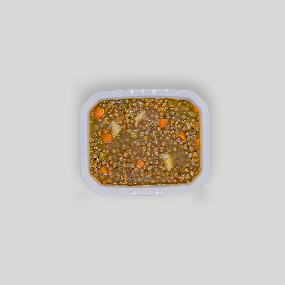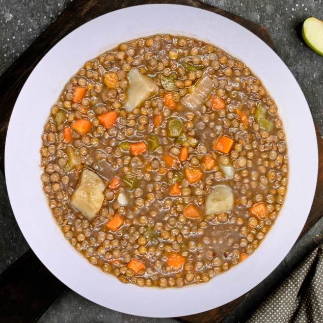 Una versión vegetal del clásico guiso, con lentejas, patata, zanahoria, pimiento verde, puerro, cebolla y tomate frito. El caldo de verdura, el aceite, los copos de patata y el pimentón aportan cuerpo y sabor.