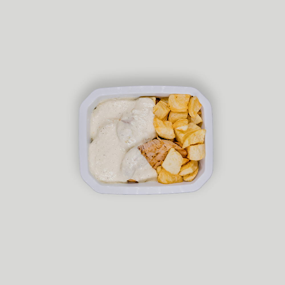 Solomillo de cerdo jugoso acompañado de patatas y cebolla, servido con una salsa cremosa y especiada a base de nata y pimienta negra que aporta carácter y suavidad.