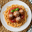Espaguetis al dente con albóndigas mixtas de cerdo y vacuno, bañadas en una salsa casera de tomate con vino blanco y verduras. Un clásico reconfortante lleno de sabor mediterráneo.