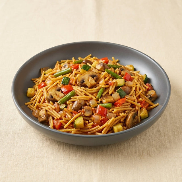 Una opción vegetal vibrante y sabrosa, que mantiene la esencia mediterránea de la fideuá con el protagonismo de las verduras y una textura ligera pero reconfortante.