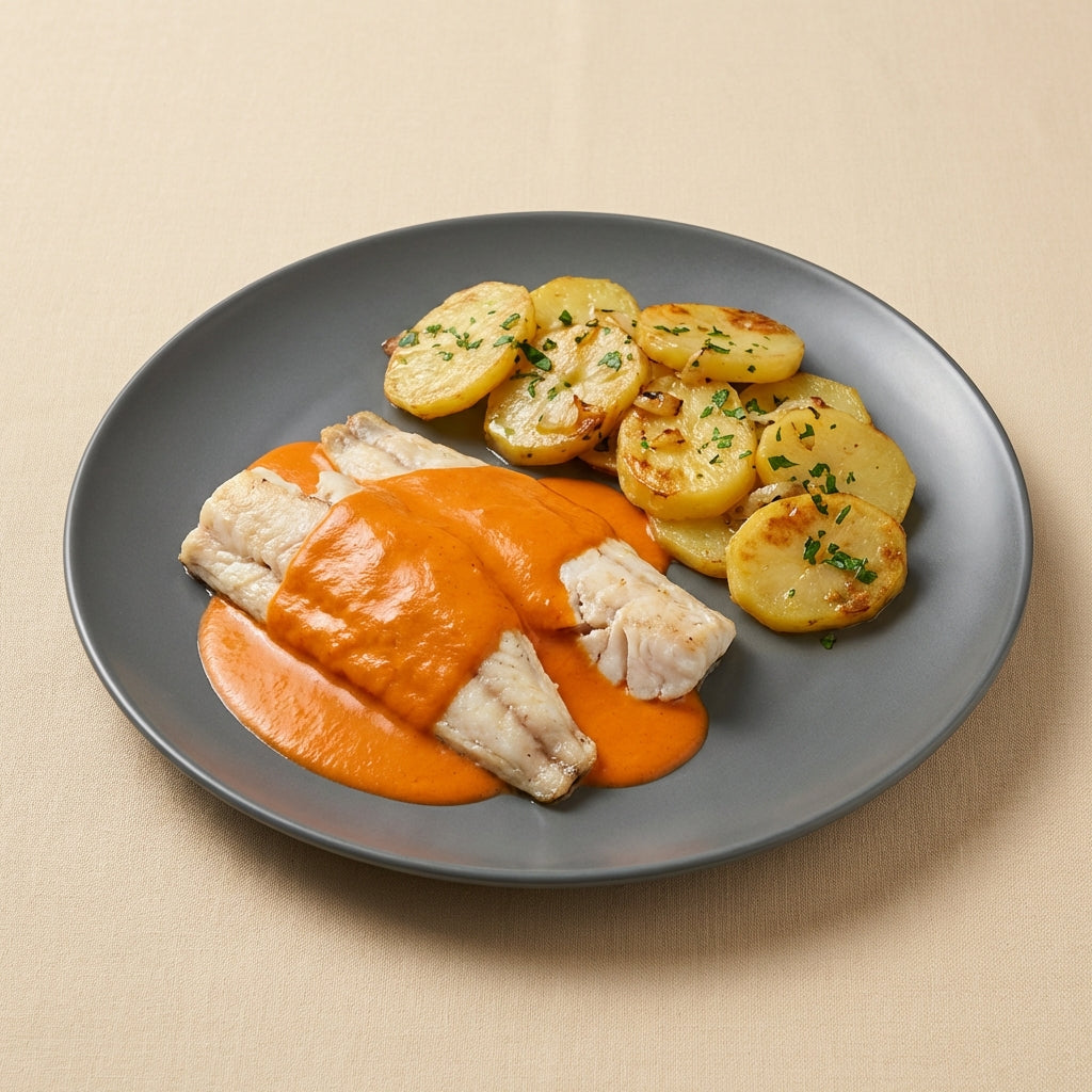 Filetes de merluza delicadamente cocinados y cubiertos con una suave salsa de pimientos del piquillo, que aporta un sabor ligeramente dulce y ahumado. La base cremosa, elaborada con nata, vino blanco y caldo de verdura, envuelve el pescado con una textura sedosa que realza su frescura.